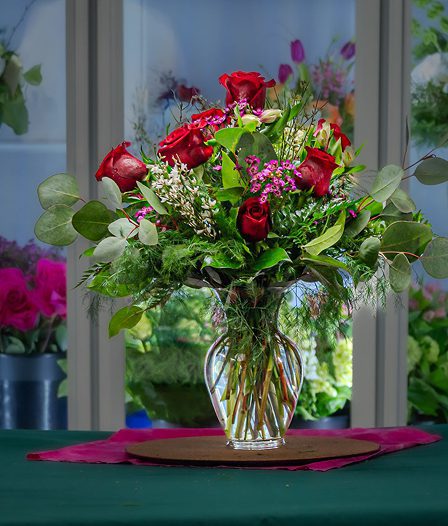 Vases include mixed Greenery, Waxflower / Genestra in a Classic Urn Vase, Square Cube or Basket